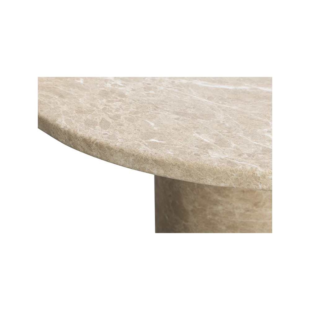 The Bloom Dining Table is a stunning modern centerpiece designed for intimate gatherings. Measuring 47 inches in diameter, its round tabletop and matching cylindrical pedestal base are finished in luxurious gold marble, featuring warm beige tones with subtle natural veining. The sculptural pedestal design creates a clean, uncluttered silhouette, allowing for comfortable seating of up to four while maximizing floor space.