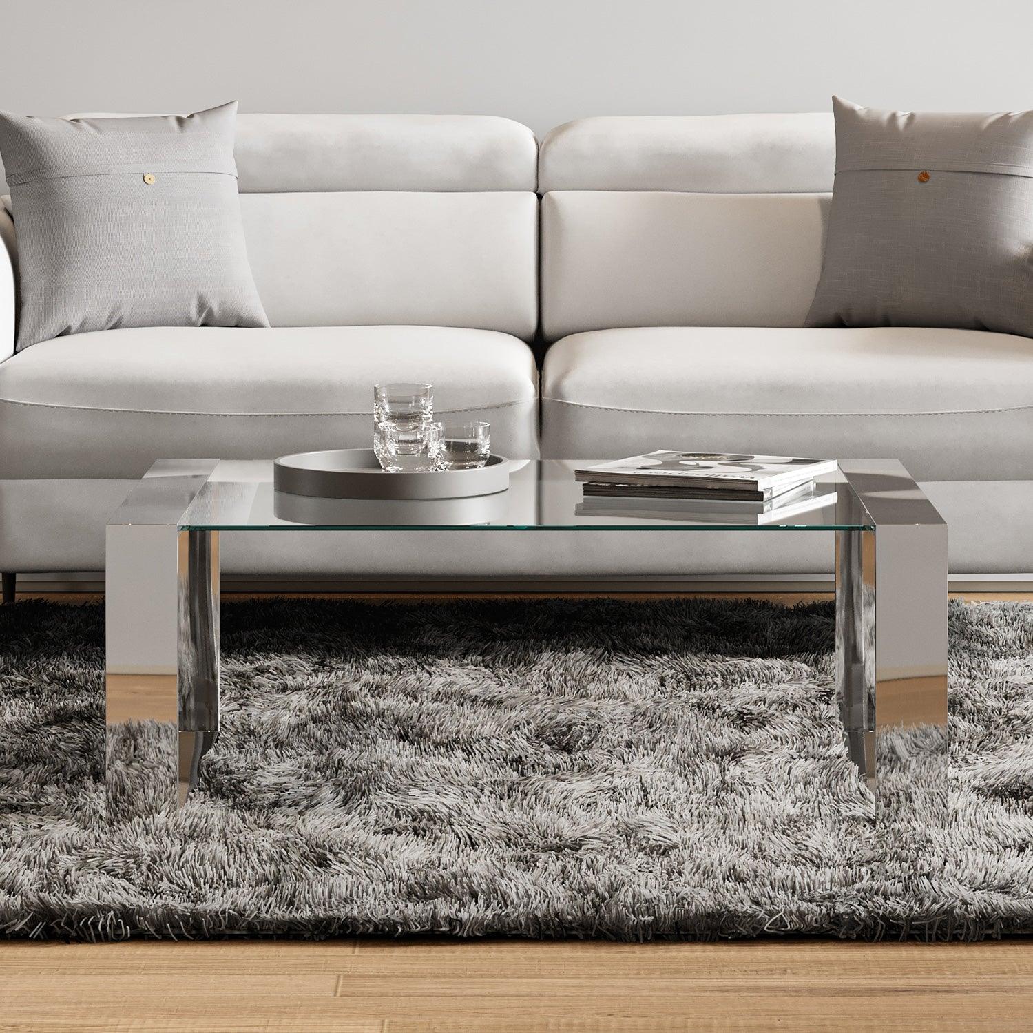 Sleek, shiny and elegant, this glass and chrome-colored coffee table brings an edgy feel to your urban living room. Paired with modern furniture, the Caterina Glass Modern Coffee Table brings clean lines and minimalist elegance to a living room.Made of a solid frame with a tempered glass top, this table is the perfect modern accent.