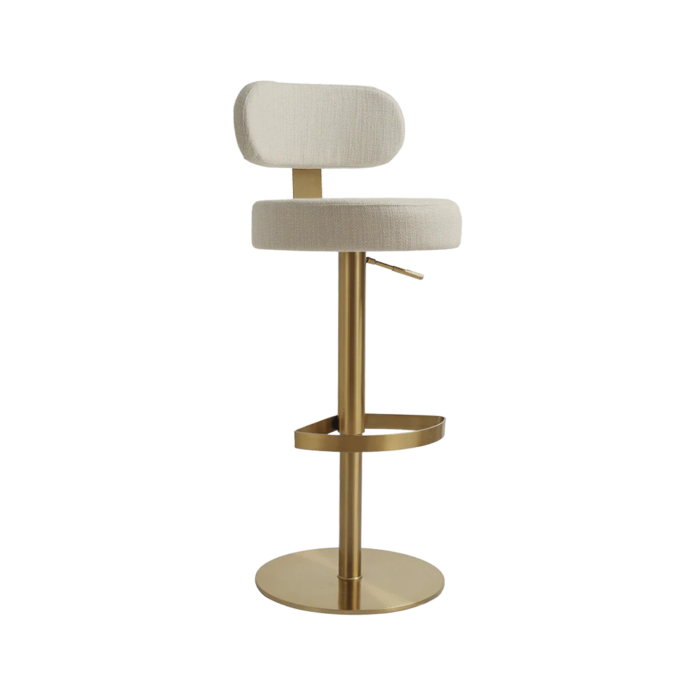 The Cedar Stool in Cream features a sleek, modern design with a plush cream-colored upholstered seat and backrest, paired with a polished brass base. Its 360-degree swivel, adjustable height and circular footrest provide customizable comfort, while the round brass pedestal ensures stability. Ideal for kitchen islands or bar counters, this still combines elegant simplicity with a luxurious touch.