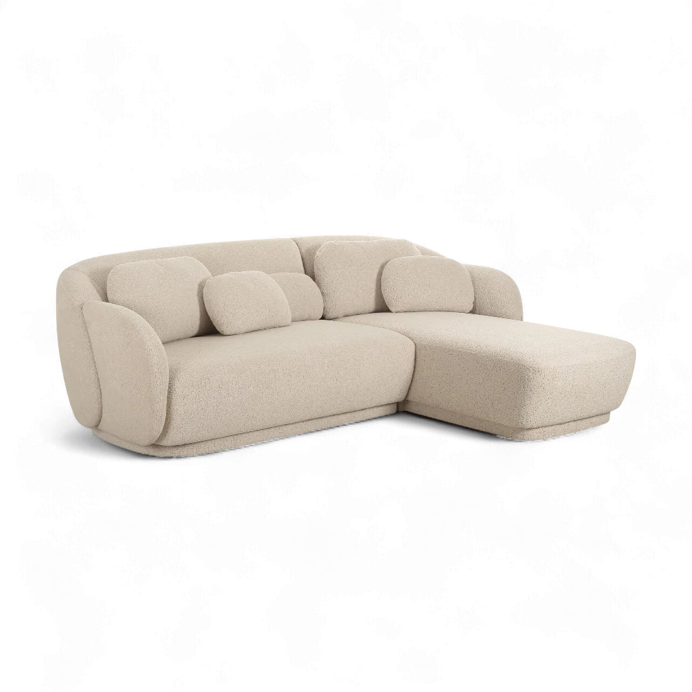 Sink into plush comfort with the Etrusca Sectional, wrapped in a soft cream boucle fabric. Its low-profile, curvaceous design features deep seating and a cozy chaise, accented by included bolster pillows for effortless lounging. Perfect for relaxed, modern living.