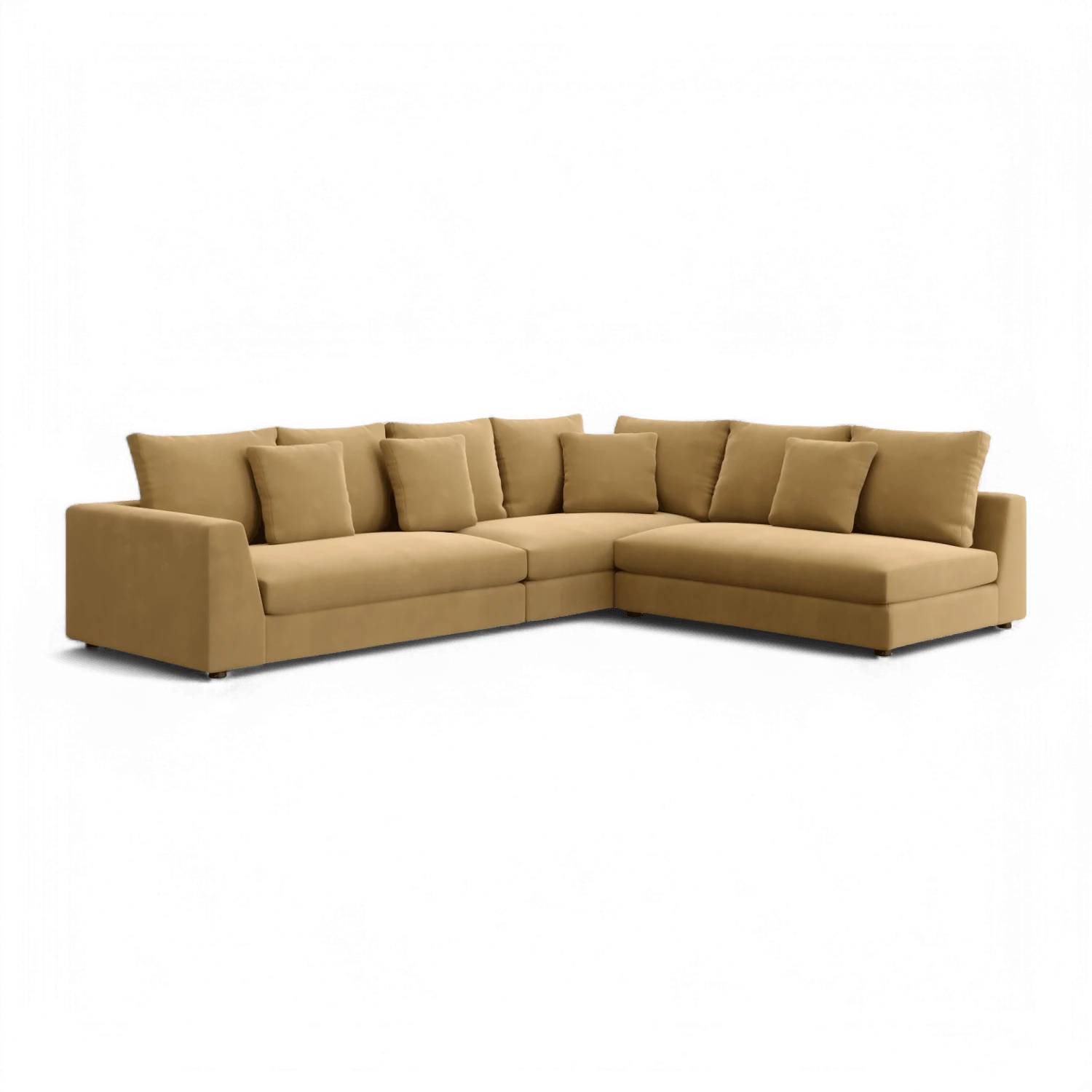 Designed with a squared armrest and a sleek back, the Gianni sofa exudes contemporary elegance while providing ample support. Generously sized back pillows and four matching throw pillows enhance its comfort, making it the perfect place to unwind after a long day. Whether you're entertaining guests or enjoying quiet evenings at home, the Gianni Sectional Sofa Camel Velvet delivers style and relaxation in equal measure.