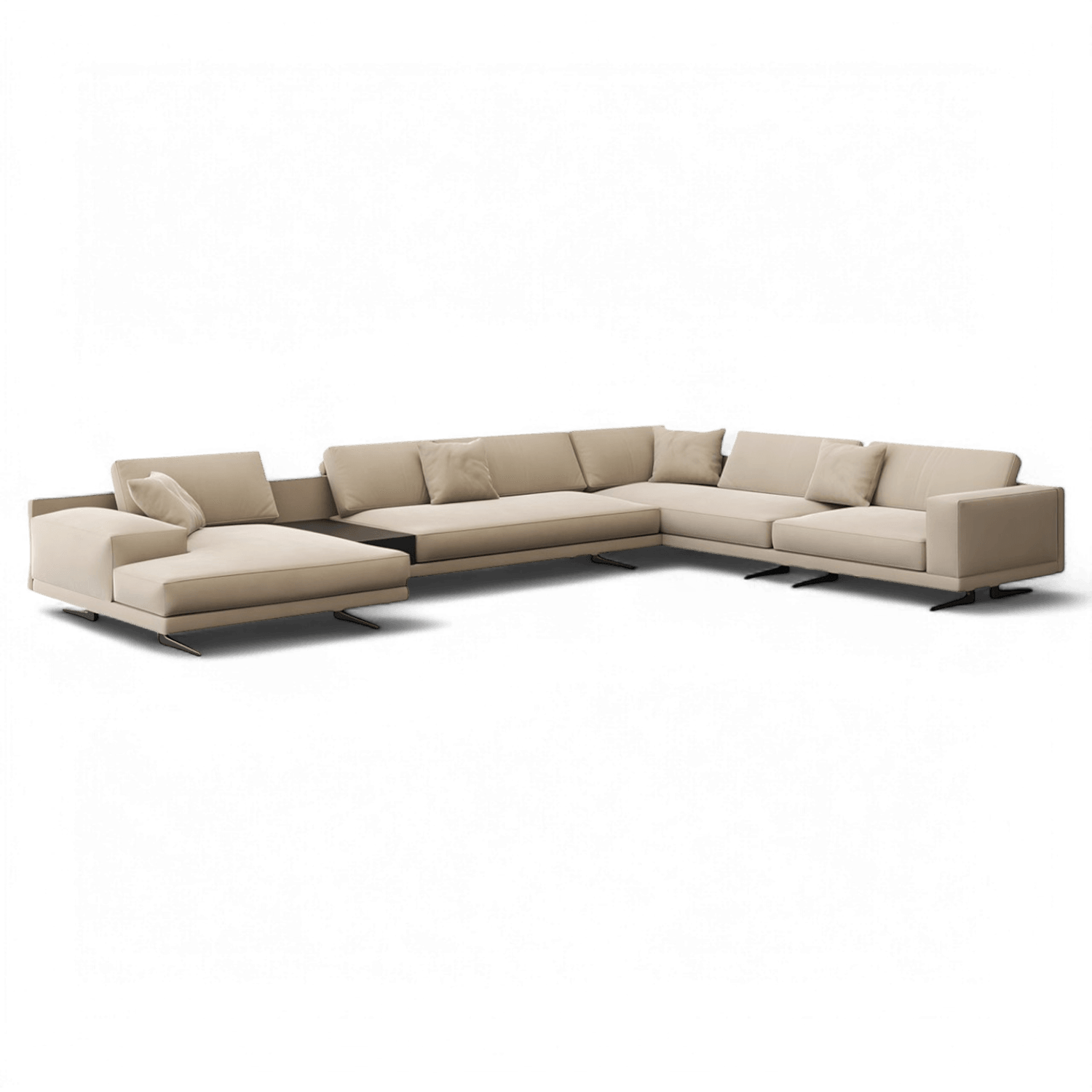 The sleek, squared arms and backrest give the Maestro a sophisticated, streamlined aesthetic, while the thoughtful design includes a built-in side table section, perfect for keeping essentials like books, beverages, or décor items within easy reach. A chaise seat on one end adds an extra layer of comfort, ideal for lounging or stretching out after a long day.