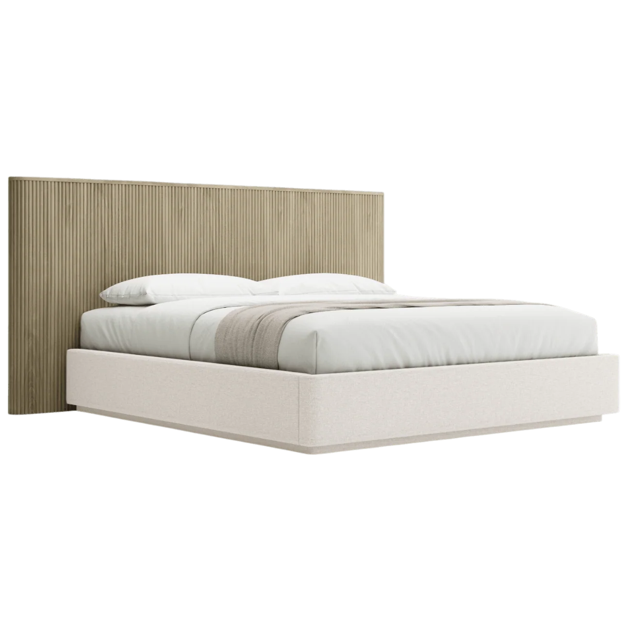 The Oxford Bed blends modern sophistication with natural charm, making it a standout centerpiece for any bedroom. The headboard showcases a sleek wood slat design, adding warmth and texture, while the cushioned fabric side rails in a versatile greige tone provide a touch of soft elegance. The harmonious combination of materials and its clean, minimalist lines offer a contemporary aesthetic that feels grounded and inviting, perfect for creating a serene retreat.