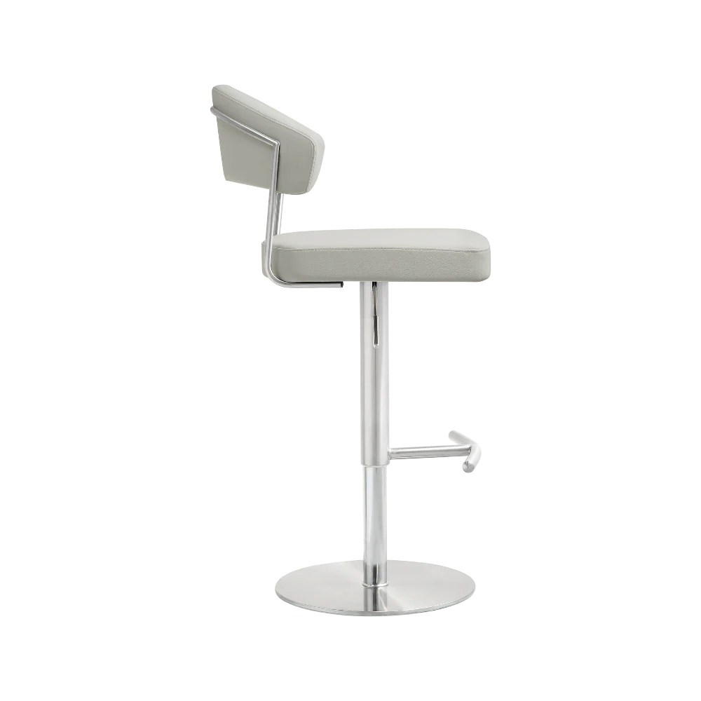 Elevate your modern kitchen, bar, or lounge space with the sleek Sam Stool in Light Gray, a versatile adjustable-height bar stool that combines minimalist design with everyday functionality. Crafted with a luxurious vegan leather seat and backrest, this stool offers plush comfort for extended seating, while its curved, ergonomic back provides subtle support without overwhelming the space. The polished stainless steel pedestal base and footrest add a touch of contemporary shine, ensuring stability and effortless leg relief.