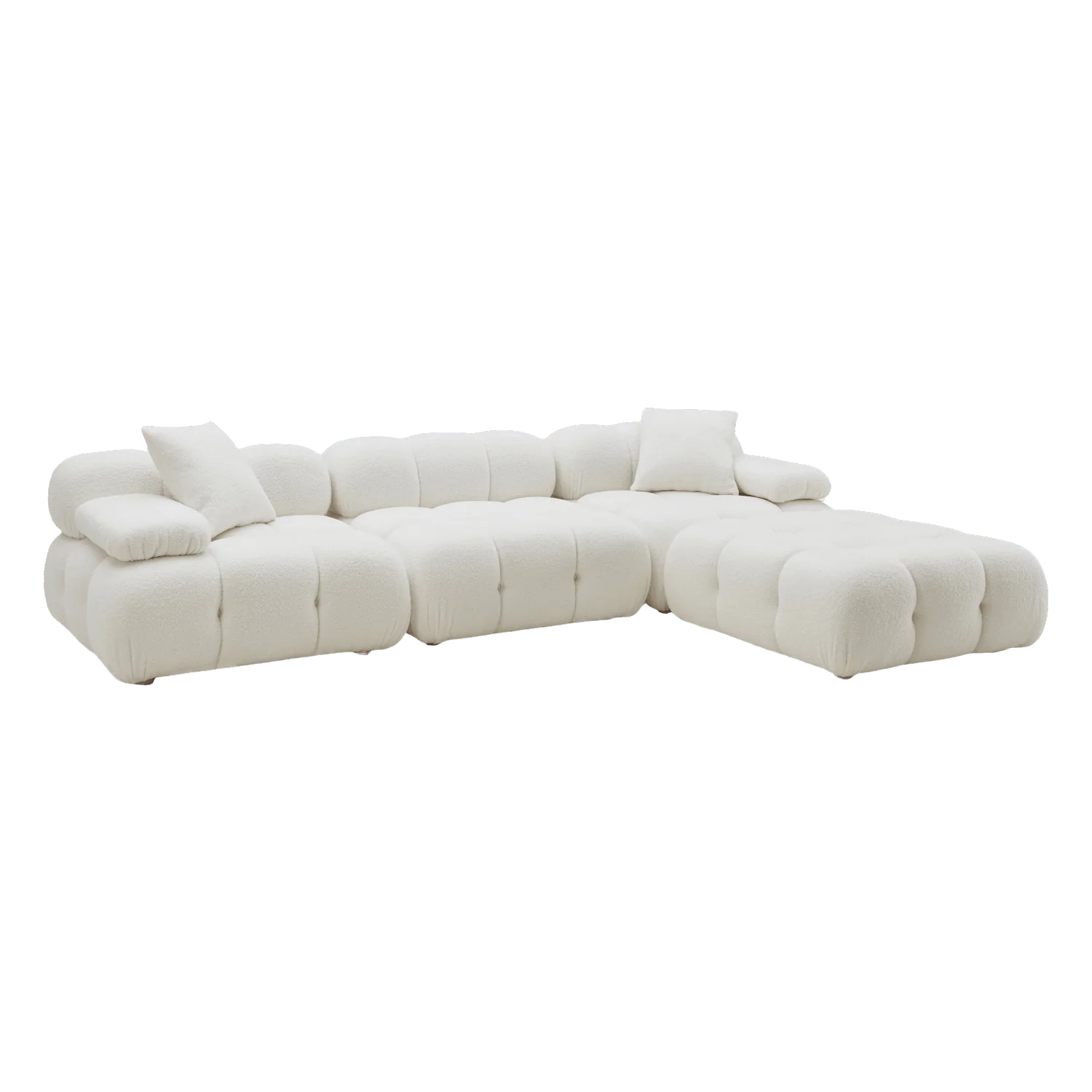 The Solace Modular Sectional in Cream Vegan Shearling offers versatility and comfort. With its modular design, you can customize your seating arrangement to fit your space while enjoying the plush texture.