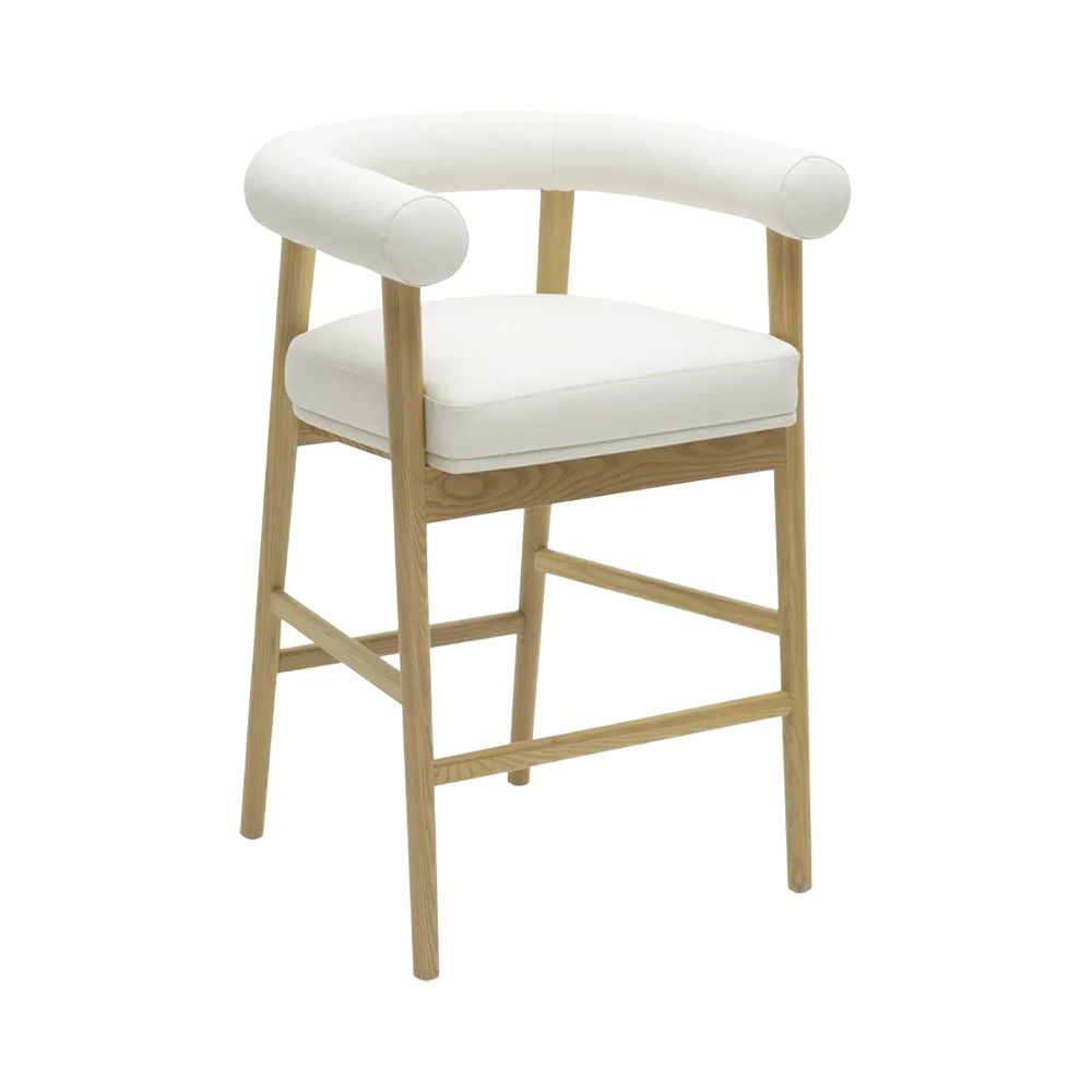 The Sorrento Counter Stool in White feature a stylish, modern design with a soft white-colored upholstered seat and backrest, complemented by an oak frame. The curved, cushioned armrests and backrest provide ergonomic comfort, while the natural wood legs add a touch of rustic elegance. Perfect for kitchen counters or bar areas, this stool blends functionality with a sophisticated aesthetic.
